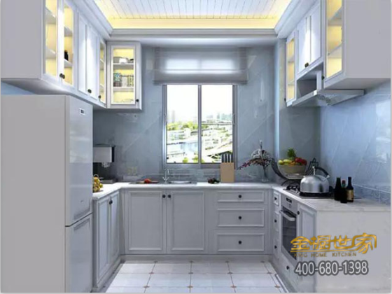 U型櫥柜,形成一個(gè)料理的天地。比較適合正方形房型的廚房。
