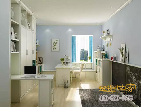 書(shū)房里不管是書(shū)桌還是衣柜都采用一系列純白色,而墻上是用淺藍(lán)色底墻代替純白色墻面,淺藍(lán)色同樣給家居清新舒服的觀感,一點(diǎn)也不會(huì)影響到整體全屋定制裝修的效果。